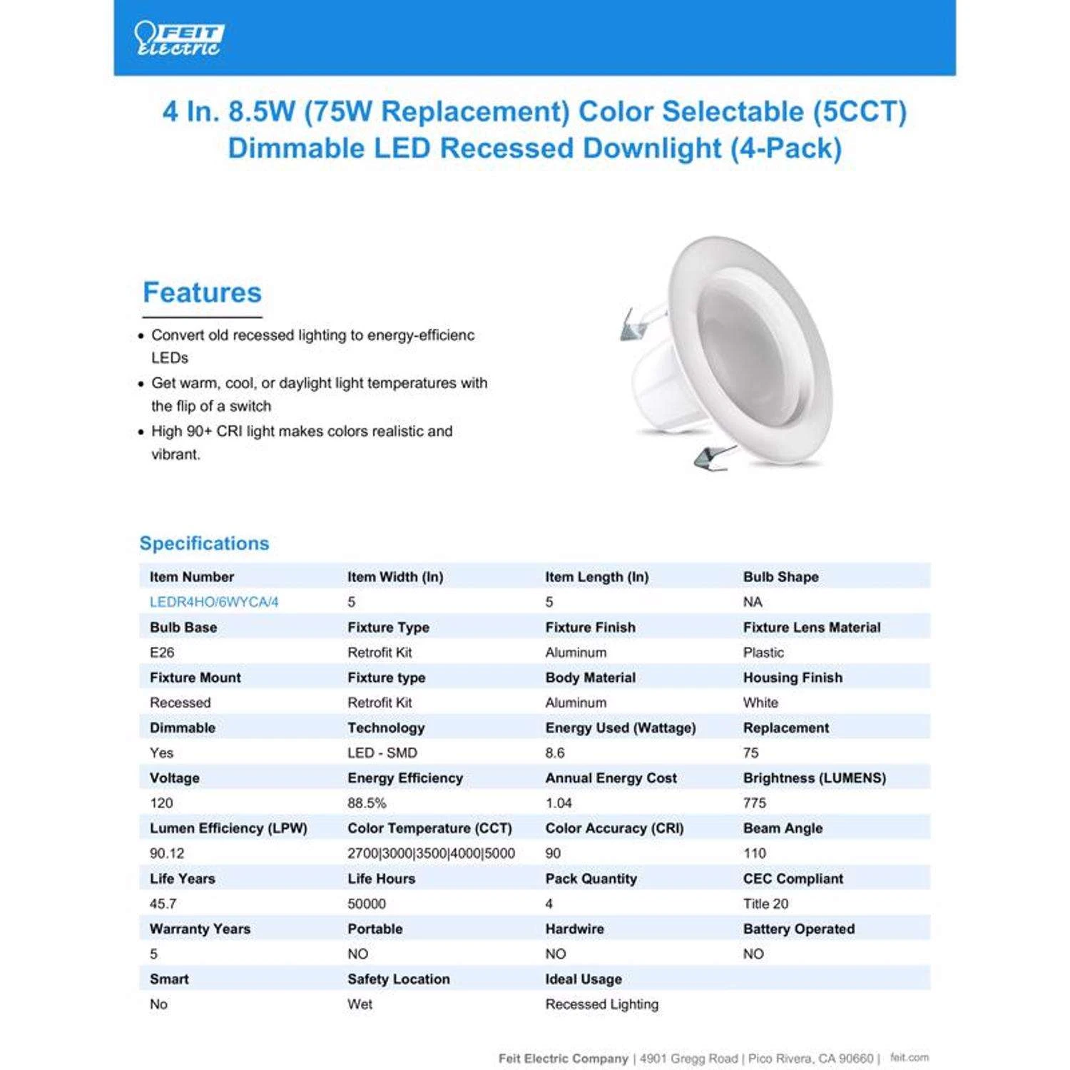 Be the first to review “Feit Enhance White 5 In. W Aluminum LED Dimmable Recessed Downlight 8.6 W” Cancel reply