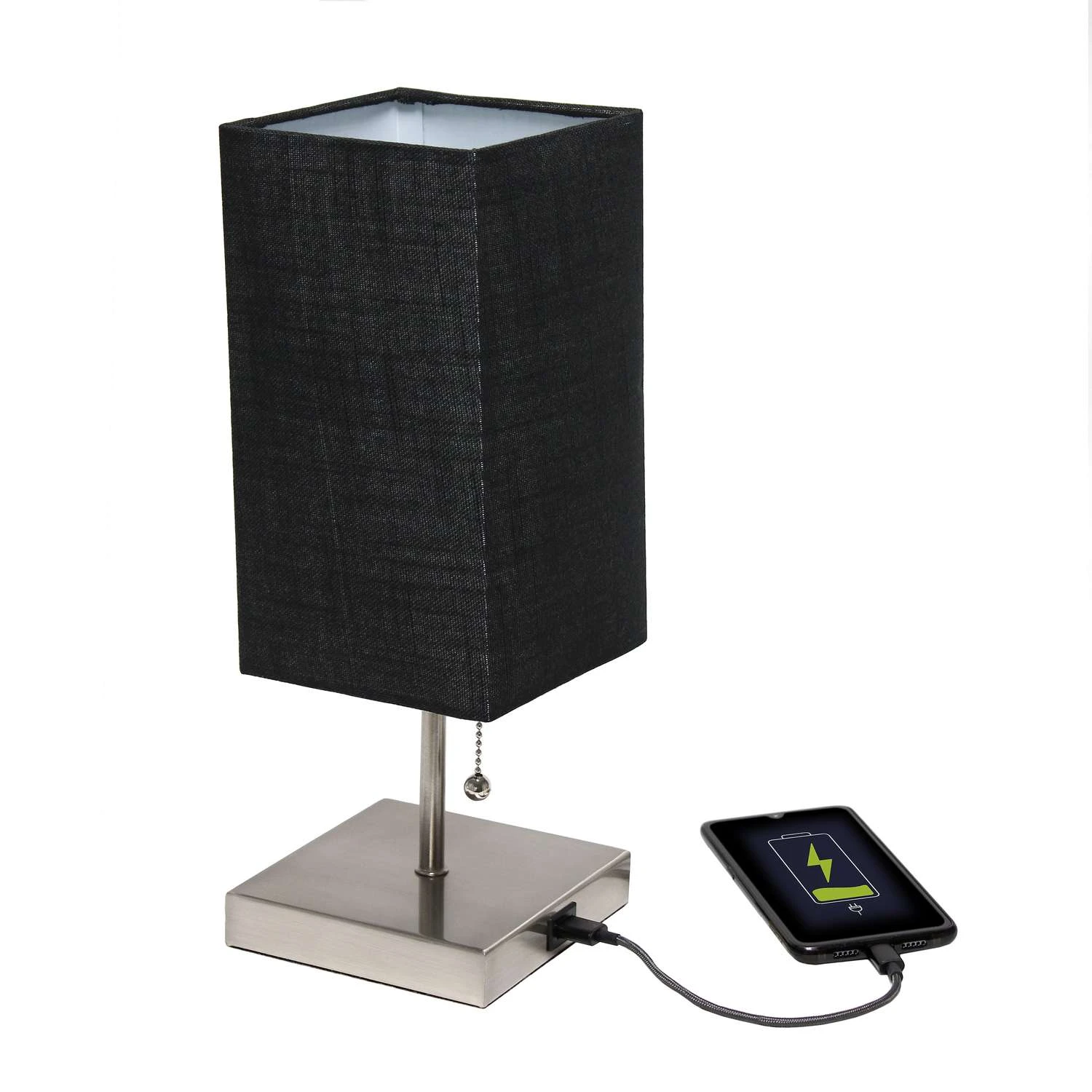 Simple yet fun, this fashionable table lamp features a brushed nickel base and a fabric shade. It comes equipped with a USB seated in the base for use to charge mobile phones, handheld games, tablets and other small electronics. This lamp will add a fabulous flair to any room. Perfect for bedrooms, kids and teens, college dorms, nurseries or fun offices. Brushed nickel base with USB charging port on base Uses 1 x 40W type a medium base bulb Features a USB port on base for charging your phone or other devices Perfect for any room