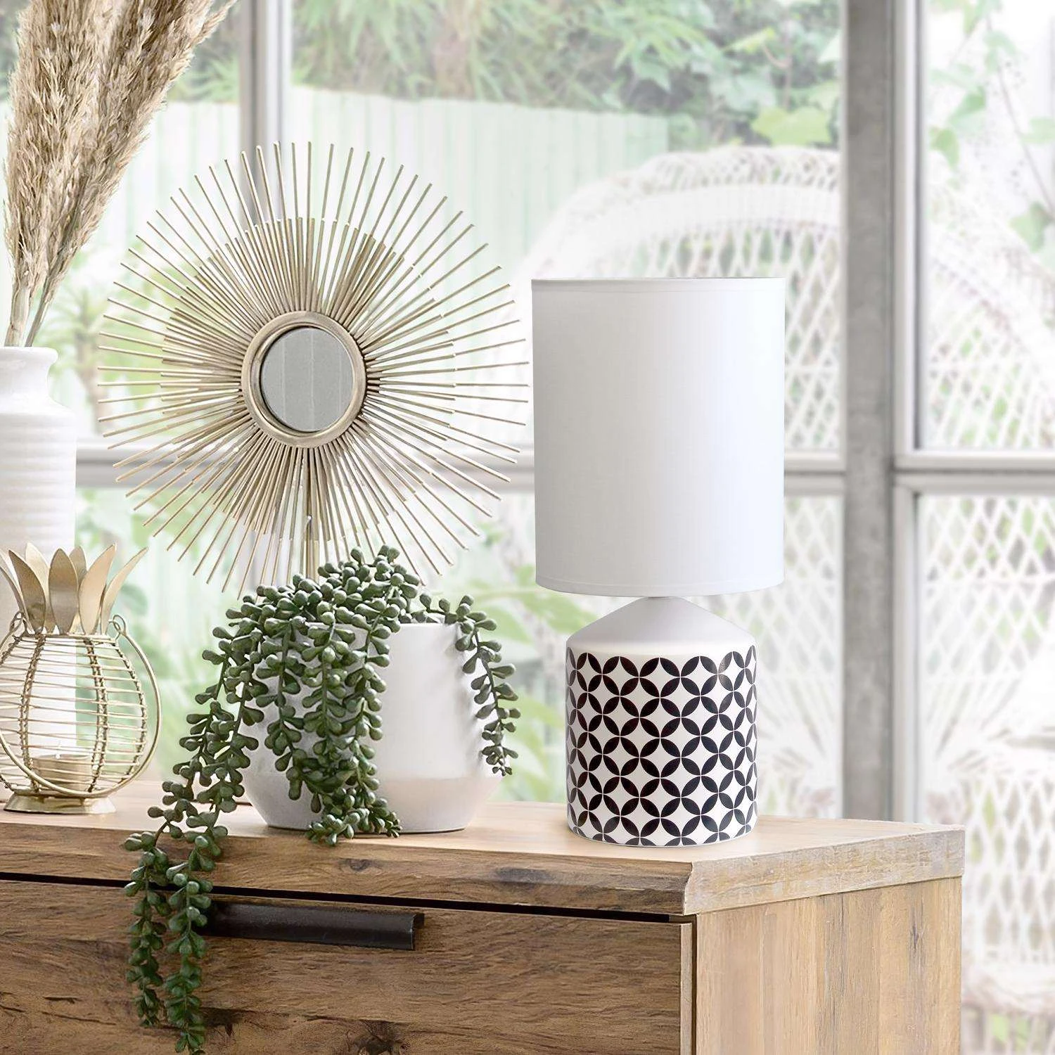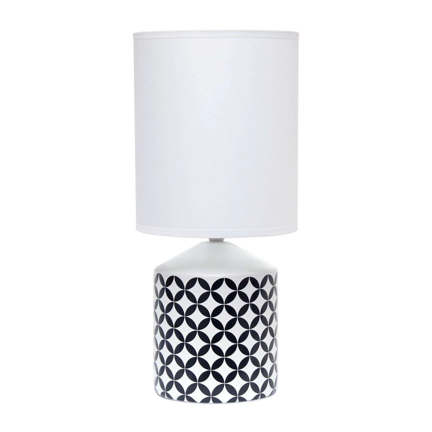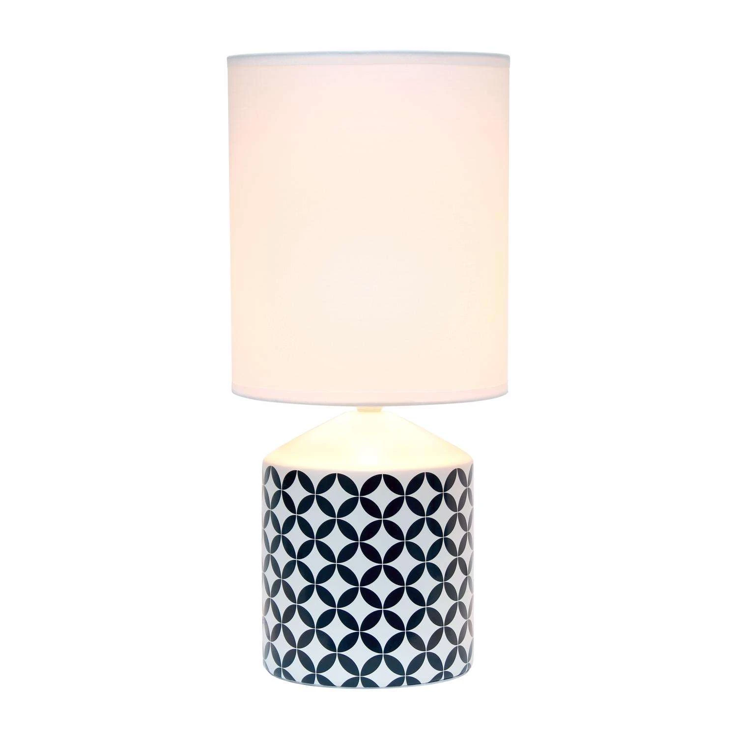 A repeating ripple pattern is the key element to this beautifully designed table lamp. A painted ceramic base is paired with a matching fabric shade to easily incorporate this lamp to your space. This versatile lamp is ideal for the nightstand in your bedroom, your office desk and even your entryway table. Perfect for living room, bedroom, kids room/nursery or college dorm Round fabric white shade Uses 1 x 60-watt type A medium based bulb (not included) Easily accessible on/ off switch located on the cord 5 ft. white plugin cord Number of options with different prints available