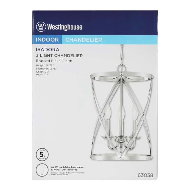 | Search Field | Westinghouse Isadora Brushed Nickel Gray 3 lights Chandelier Light Fixtures Chandeliers and Pendants DECORATIVE LIGHT FIXTURES INTERIOR DECORATIVE WESTINGHOUSE LIGHTING CO Westinghouse Isadora |
