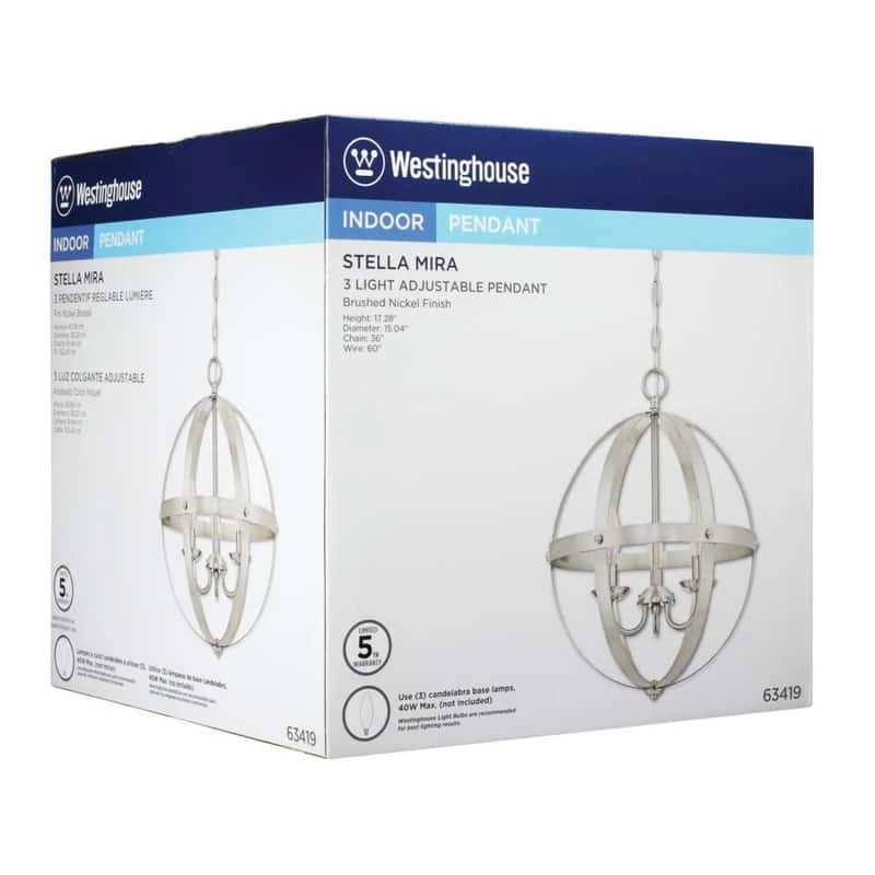 | Search Field | Westinghouse Stella Mira Brushed Nickel 3 lights Pendant Light Light Fixtures Chandeliers and Pendants DECORATIVE LIGHT FIXTURES LED TRACK & PENDANT WESTINGHOUSE LIGHTING CO Westinghouse Stella Mira |